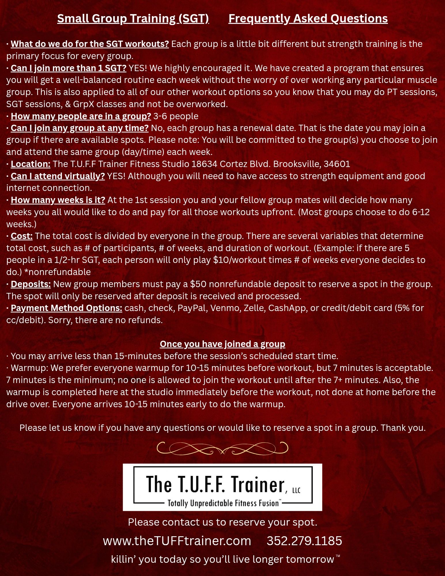 These are our existing groups one may join on the renewal date if there are available spots. You may also gather your own family and friends to create your own SGT during a different day/time.